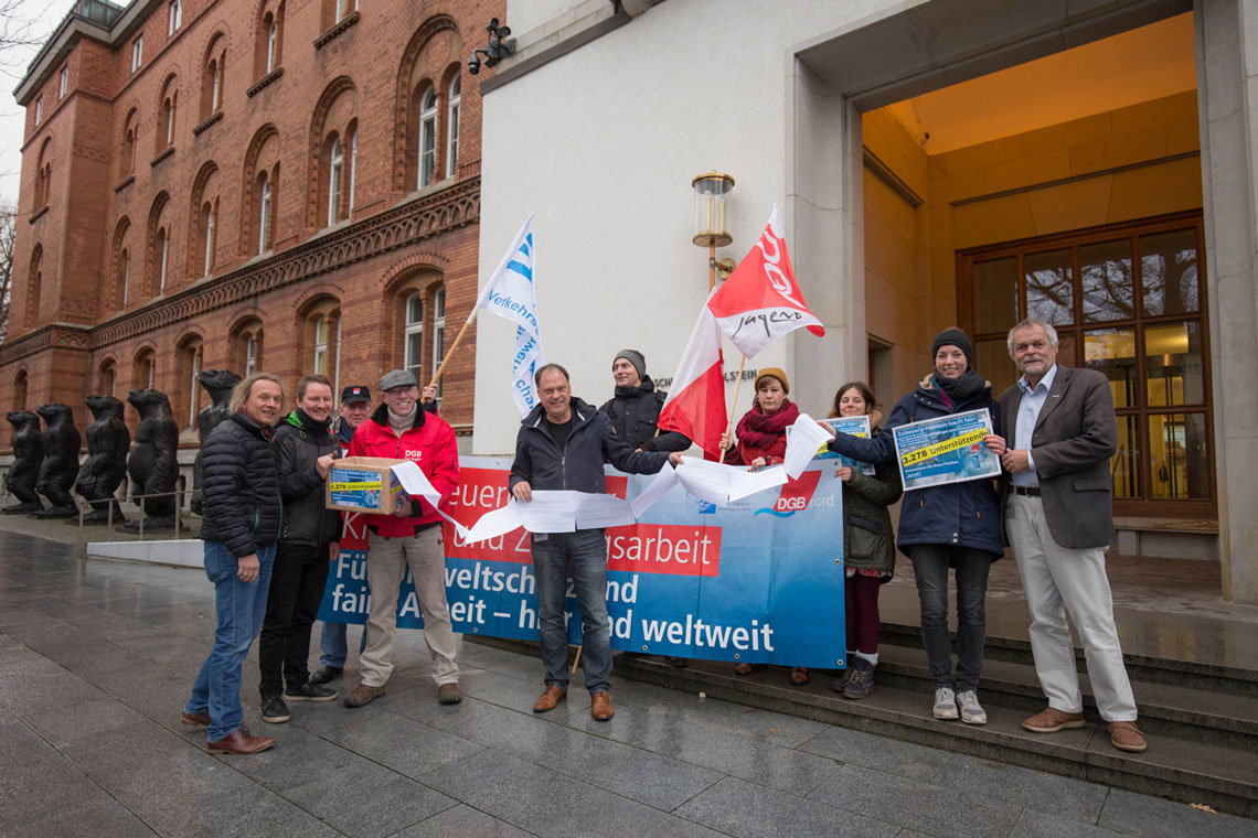 Am 13.12.2018 wurden vor dem Landeshaus in Kiel die gesammelten Unterschriften symbolisch dem Vorsitzenden des Wirtschaftsausschusses, Andreas Tietze, überreicht und die Forderung weitergegeben, Nachhaltigkeitskriterien verbindlich in den derzeitigen Entwurf einzuarbeiten.