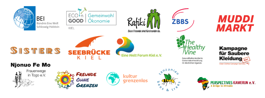 Bündnis Eine Welt Schleswig-Holstein e.V., Eine Welt Forum Kiel e.V., Freunde ohne Grenzen e.V., Förderverein The Healthy Vine e.V., Gemeinwohlökonomie Regionalgruppe Kiel, Kampagne für Saubere Kleidung Kiel, kulturgrenzenlos e.V., MUDDI Markt e.V., Njonuo Fe Mo - Frauenwege in Togo e.V., Persspectives Kamerun e.V., Rafiki e.V., Seebrücke Kiel, Sisters - Frauen für Afrika e.V., Tanzanian Bees and Trees e.V., ZBBS e.V.