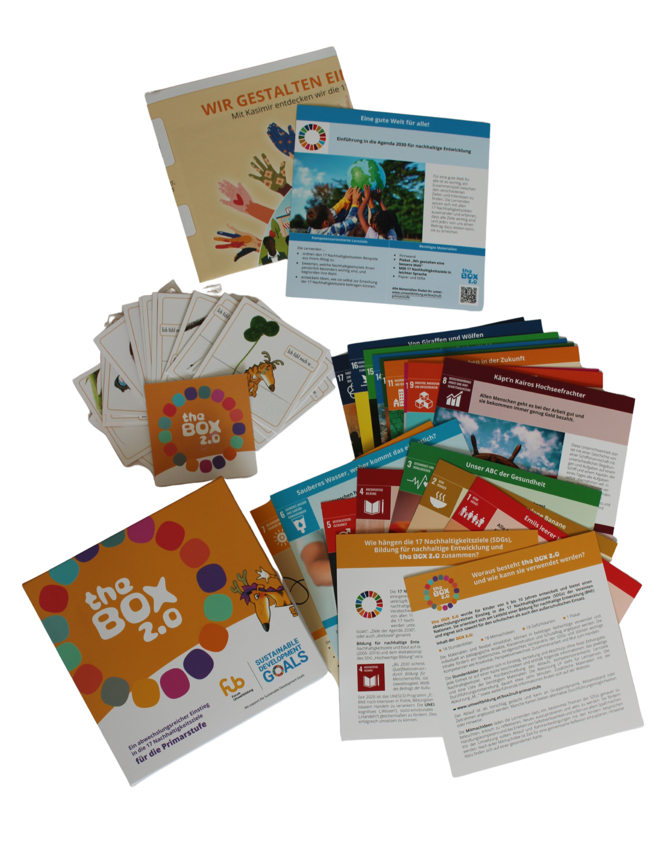 In kleinen Schritten zu großen Zielen: Die 17 Nachhaltigkeitsziele der Vereinten Nationen (SDGs) umfassen soziale, ökonomische, ökologische und politische Themen. Ihr Ziel ist eine Transformation der Welt, sodass alle Menschen – jetzt und in der Zukunft – gut leben können. Durch vielfältige spielerische Zugänge fördern die Methoden von the BOX 2.0 Primarstufe neben Wissen über Nachhaltigkeit auch eine altersgerechte emotionale und soziale Auseinandersetzung mit den Themen einer gerechteren und nachhaltigeren Zukunft. Wesentliche überfachliche Kompetenzen, die für diesen Wandel nötig sind, wie Zusammenarbeit, Kreativität, Selbstwirksamkeit und (Selbst-)Reflexion stehen dabei im Zentrum. Das Methodenset richtet sich an Lehrkräfte und Bildungsreferent*innen, die mit Grundschulkindern arbeiten und besteht aus 18 Stundenbildern, 18 Mitmachideen, Gefühlskarten und einem Schauplakat. Es wurde vom Forum Umweltbildung (fub) in Österreich konzipiert und hat daher auch einige lebensweltliche Bezüge zu Österreich. Mehr Hintergrundinfos