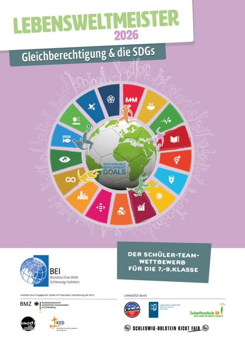 Die Veranstaltung ist Teil des SDG-Jahresthemenprogrammes "Schleswig-Holstein und die Welt im Wandel: Gemeinsam für SDGs und globale Gerechtigkeit" des Bündnis Eine Welt Schleswig-Holstein e.V. (BEI), unterstützt durch NDTSV Holsatia Kiel, Landesbeauftragten für politische Bildung SH, Zukunftsschule SH und Schleswig-Holstein Kickt Fair; gefördert durch Engagement Global mit finanzieller Unterstützung des BMZ, BINGO! Die Umweltlotterie und dem Kirchlichen Entwicklungsdienst der Nordkirche (KED).